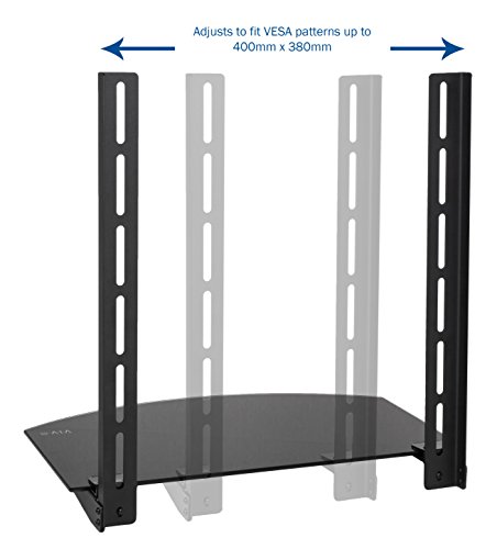 -. Feature : COMPATIBILITY - Tempered Glass Shelf and sturdy steel frame support weights up to 22 pounds and can accommodate VESA mounting hole patterns up to 400mm x 380mm / VERSATILITY - Ideal for storing your cable or satellite box, DVD player, stereo components, gaming devices, and more. Shelf can be mounted below or above TV for different configurations / APPEARANCE - Sleek, high gloss black color blends in well with most environments and helps maintain low profile / VESA COMPLIANCE - The mounting brackets mount between your existing wall mount and the back of your TV and adjust to any VESA pattern up to 400mm x 380mm / ASSEMBLY - Instructions and hardware necessary for assembly and mounting processes have been provided