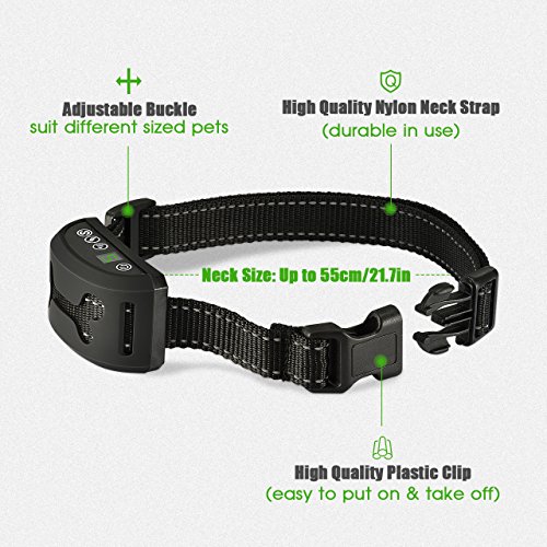 Intelligent Recognition Are you annoyed that your dog's anti-bark collar is working for other dog's barking while your dog keeps silent? This collar will solve your problem. Its sensor can only recognize your dog's Sound combined with Vibrations of Sound intelligently, thus only your dog will trigger the sensor, not other barking dogs!!! Specifications: Product Dimensions: 8.9 * 4.9 *7.2cm/3.5*1.93*2.83in Product Weight: 140g/4.9oz Color: Black Note: Do be used on healthy dogs. Do not use this product to attempt to correct the behavior of aggressive dogs. Please take off the collar when your dog is ready for a shower or swimming. Package Included: 1 x Receiver 1 x Nylon Belt 1 x User Manual 0