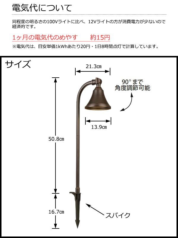 | 仕様 | 3WLED 色温度:3000K(電球色) 全光束:165ルーメン 電圧:12V 定格寿命:約40000時間 90度まで照射方向調整可能 ブロンズ色 防雨型 LED交換不可 専用トランス及びケーブルが別途必要 メーカー指定以外の電源トランスは使用不可 |