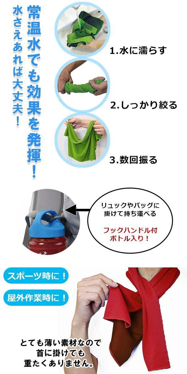 | 水に濡らして絞って数回振るだけでひんやり冷たくなるタオル。常温水や汗でも効果を発揮するので、スポーツや屋外での作業やレジャーに最適!フックハンドル付ボトル入りで持ち運びも便利です。とても薄い素材なので、首に掛けても重たくありません。 |