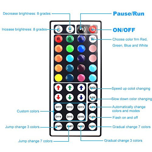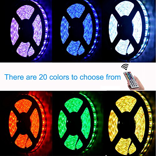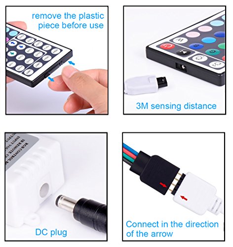 - ✅All in one kit: You will get 1pcs 16.4ft led strip Light, 1pcs 44 Keys IR remote controller, 1pcs IR Control Box , 1pcs 12V power supply. No need for other accessories