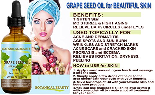 - GRAPE SEED Oil helps damaged skin like ACNE, PSORIASIS, ECZEMA, DERMATITIS, SUNBURN, STRETCH MARKS, BURNS, CUTS, SCARS, ACNE AND CELLULITE.