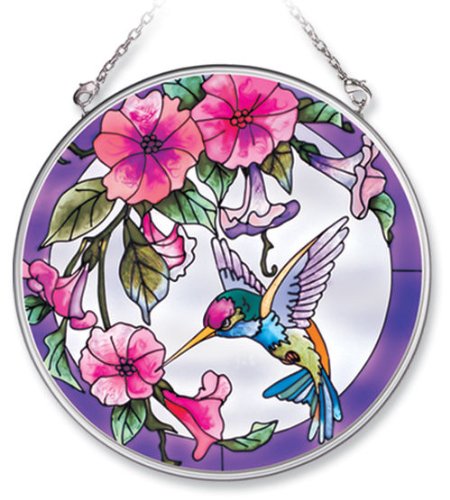 Amia Handpainted Glass Pink Morning Glory and Hummingbird Suncatcher, 4-1/2-Inch