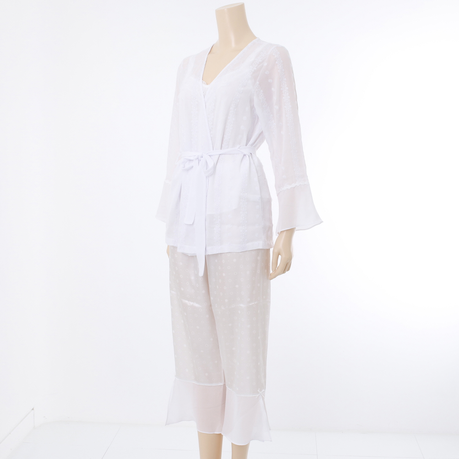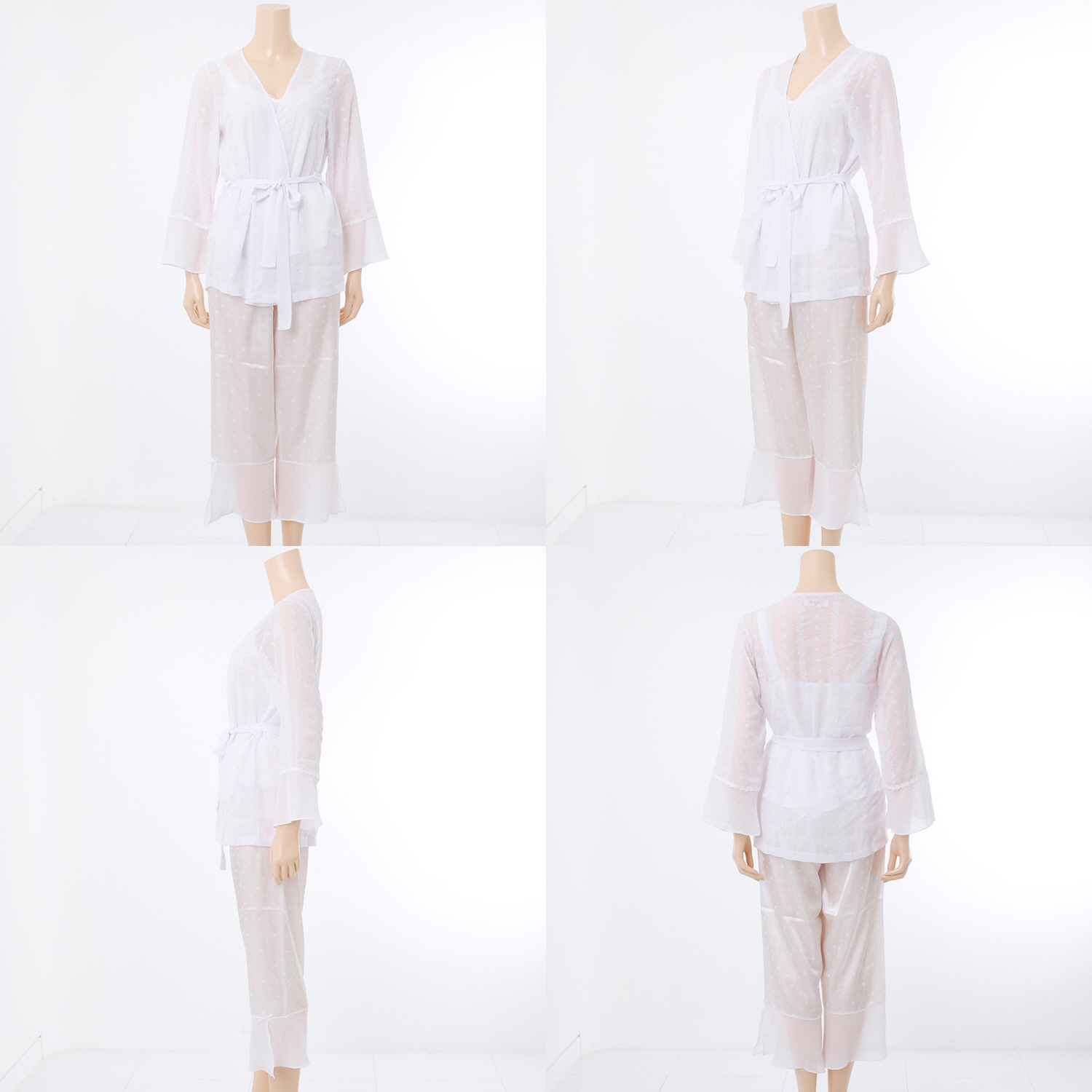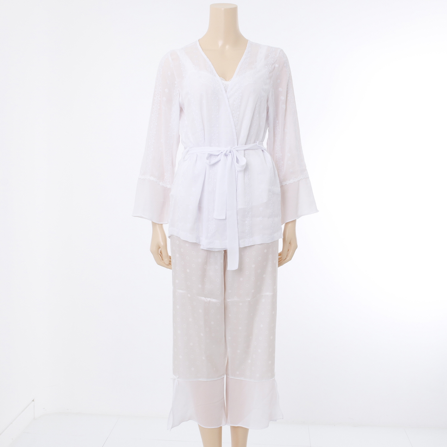 폴리 자가드 제품에 가운이 있는 3피스 여성잠옷입니다.