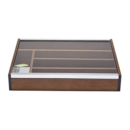 Size 14,5 x 10,6 x 1,8 inches with 5 compartments and glass cover