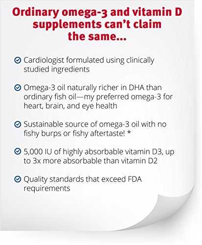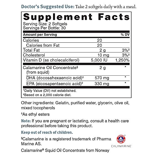 Ordinary omega-3 and Vitamin D supplements can't claim the same... Cardiologist formulated using clinically studied ingredients Omega-3 oil naturally richer in DHA-Dr. Sinatra's preferred omega-3 for heart, brain, and eye health Sustainable source of omega-3 oil with no fishy burps or fishy aftertaste!* 5,000 IUs of highly absorbable Vitamin D3, up to 3x more absorbable than vitamin D2 As a cardiologist, Dr. Sinatra recommends everyone supplement with a high quality omega-3 oil. He knows it's difficult to get enough of the right omegas (omega-3s) in your diet-especially DHA, which is the hardest to get enough of. He believes it's not only critical for your eye and brain health, but also heart health. That's why his Calamarine®D Omega-3 combines Calamarine oil-his preferred omega-3 oil which comes from tiny calamari squid instead of fish, is naturally richer in DHA than ordinary fish oil, and is without any fishy burps* or aftertaste!-with another daily essential nutrient, vitamin D. Research continues to grow that vitamin D is gaining recognition as a daily essential for the health of your heart and entire body, supporting: cardiovascular health, bone health and calcium absorption, physical mobility in older adults, normal blood sugar levels, cellular health, immune health, a healthy mood, and whole body health. Calamarine helps support your blood pressure, blood vessel health, and circulation, PLUS supports your brain, eyes, and digestive tract. Every dose of CalamarineD Omega-3 provides a full 2 grams of Calamarine with 570 mg of DHA and 330 mg of EPA, something that isn't easy to find at your local grocery, warehouse store, or pharmacy. Plus, 5,000 IUs of vitamin D3-the same form of vitamin D that your body naturally produces, and is up to 3x better absorbed than vitamin D2. *According to a July 2015 Consumer Survey of Calamarine product users with 118 responses.Feature