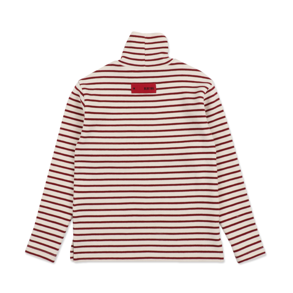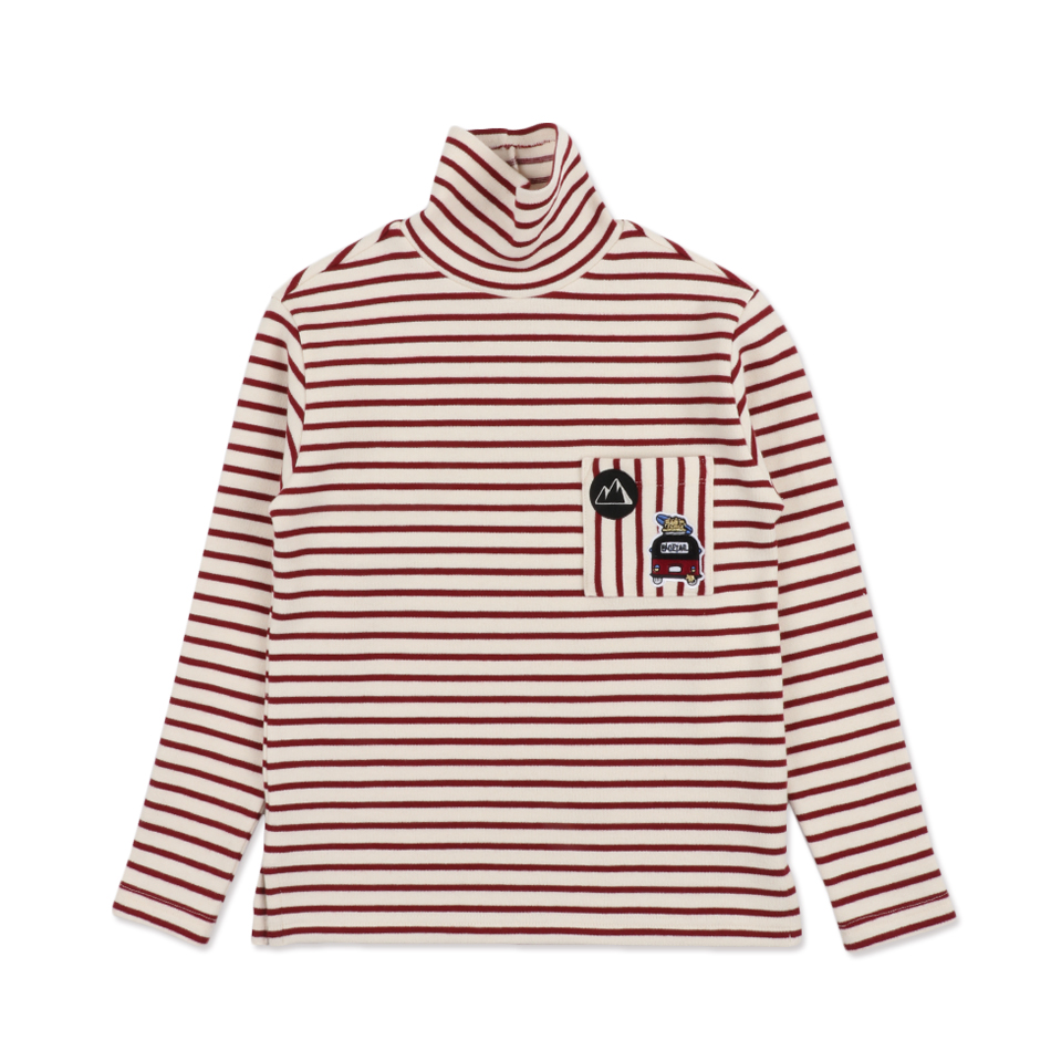 레드 스트라이프 패턴으로 제안된 일자 핏의 풀오버 티셔츠 입니다.