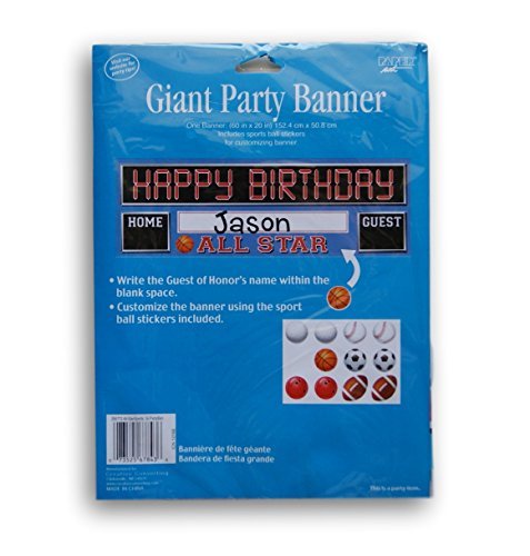 -. Feature : Giant Party Banner / Banner measures 60'' x 20'' / Scoreboard theme / Includes sports ball stickers for easy customization / Includes large blank space where you can write the name of the guest of honor!