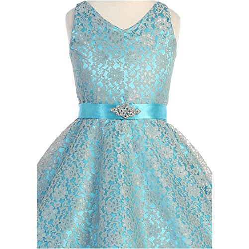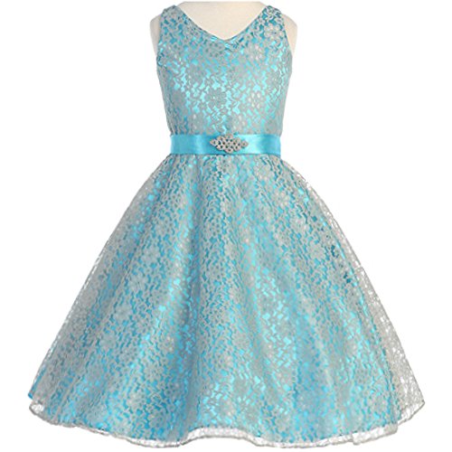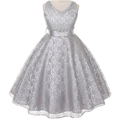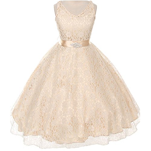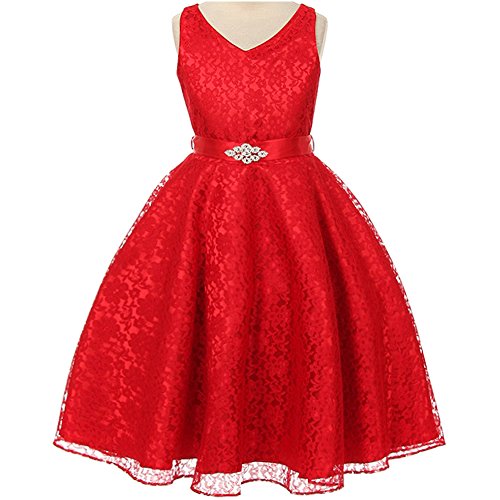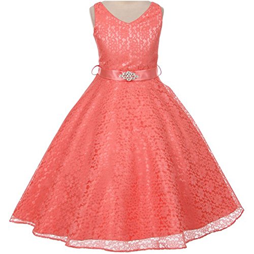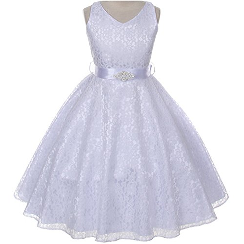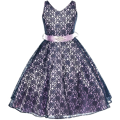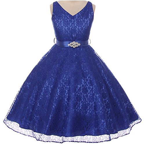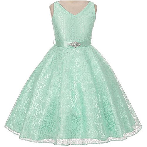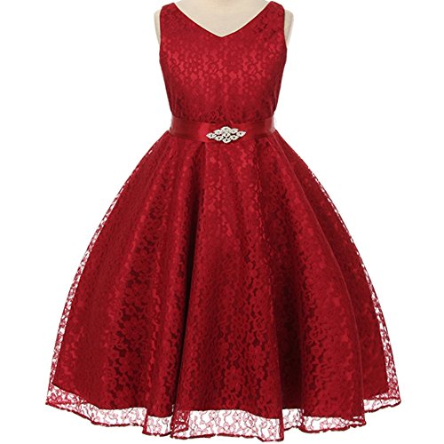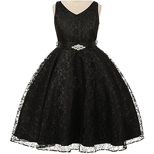 Beautiful and elegant full lace dress perfect for any special occasions for your little princess. Adjustable waist with satin sash back tie and gorgeous rhinestone brooch adorn the front waist. Available in 11 color options and size 4 - size 16.