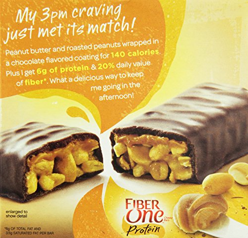 ReleaseDate : 2015-04-21 Studio : General Mills Publisher : General Mills Binding : Grocery Product Description Fiber One Protein Peanut Butter Chewy Bars. 140 calories. 3.5g sat fat, 17% DV. 140mg sodium, 6% DV. 7g sugars. 6g protein, 10% DV. 6g total fat and 3.5g saturated fat per bar. 20% daily value of fiber. Naturally artificially flavored. 0
