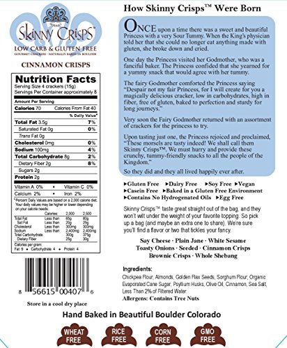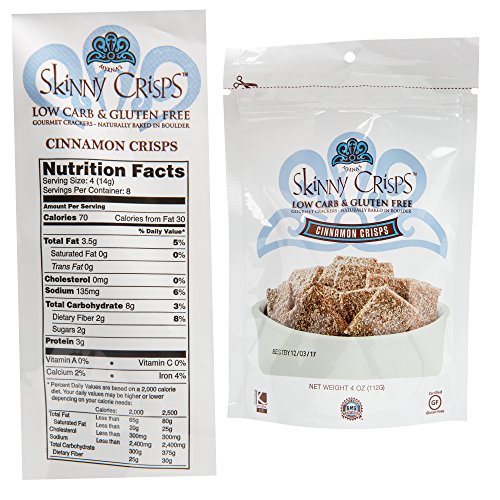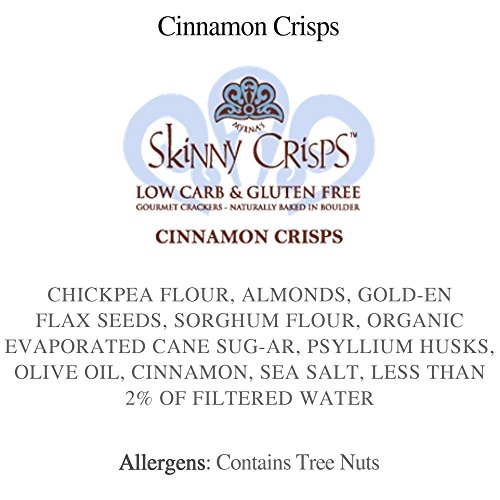 -. Feature : Pack of three, cinnamon crackers 4-ounce bags. Yummy, not too sweet topped with cinnamon sugar. Similar to a cinnamon graham but more scrumptious. / Gluten free, vegan, kosher, dairy free, non-gmo wheat free, rice free, egg free, corn & soy free. / Low carb crackers contains approximately 6 carbs per 4 crackers. Great for anyone looking to eliminate gluten or decrease carbohydrates in their diet. / Skinny Crisps are high fiber crackers, just three or four crackers accompanied with coffee, tea or juice may quickly satisfy hunger cravings. / Hand baked in gluten free facility. Tastes great straight out of the bag, and with your favorite topping.