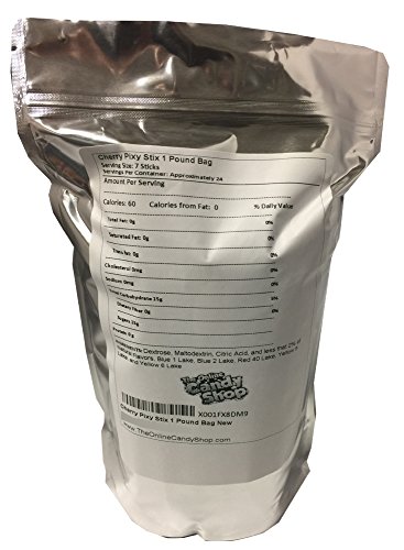 -. Binding : Misc. -. Brand : Generic -. Color : Red -. Feature : Delicious Cherry Flavored Pixy Stix in a 1 Pound resealable bag / Candy Powder filled straws in a great cherry flavor / Pixy Stix Candy straws are made of paper and are approximately 6 inches in length / Approximately 170 Pixy Stix per bag / Each order comes in a resealable bag to ensure freshness; eat what you want now and keep the rest fresh for later -. IsAdultProduct : 0 -. Label : The Online Candy Shop -. Manufacturer : The Online Candy Shop -. NumberOfItems : 170 -. PackageQuantity : 1 -. ProductGroup : Grocery -. ProductTypeName : GROCERY -. Publisher : The Online Candy Shop -. Studio : The Online Candy Shop -. Title : Cherry Pixy Stix, 1 Pound Resealable Bag by The Online Candy Shop