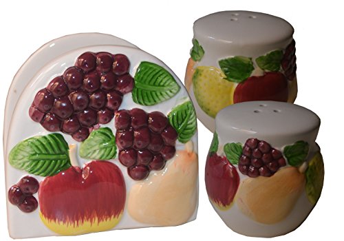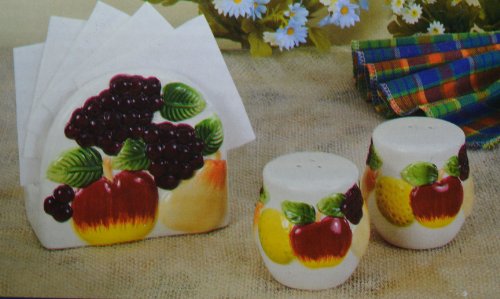 [Product Information]- This beautiful hand painted napkin holder, salt & pepper shakers are made with fine ceramic with fruit design. Makes an attractive addition and brighten up your kitchen tabletop. Napkin holder: 4.75” x 2.75” d x 4.25” H. Salt & Pepper Shaker: 2 x 3” Dia x 2.75” H