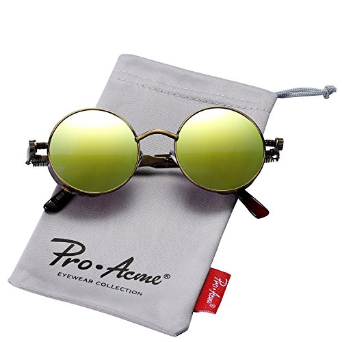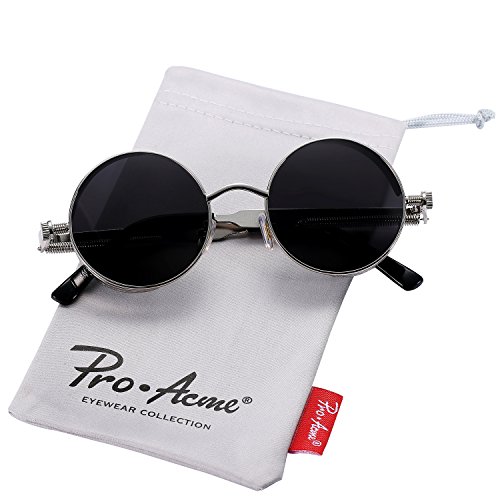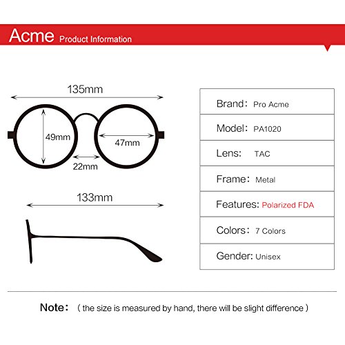 -. Feature : CLASSIC DESIGN - Pro Acme Metal circle sunglasses are totally retro. This look has been worn by legendary musicians and inspired by the 1960s counter-culture when this style first originated. These frames are perfect for men and women. / MIRRORED POLARIZED LENSES - This Retro Sunglasses is 100% Polarized and provide 99% Polarization efficiency while blocking and managing UV and HEV light, delivering a superior visual experience and glare protection. Polarized sunglasses eliminate glare and haze so your eyes are more comfortable and you can see better. Polarized lenses contain a special filter that blocks this type of intense reflected light, reducing glare. / PREMIUM PACKAGE - Comes with Leather Case, Gift Box, Microfiber Pouch, Microfiber Cleaning Cloth, User Manual and Tag. / 30 DAYS MONEY BACK GUARANTEE - 100% Satisfaction Guaranteed. Please just let us know if you're not happy with your purchase within 30 days, and we'll take care of you. You have no risk to try. / PRODUCT DIMENSION - Lens width:47mm (1.85") | Lens height:49mm (1.93") | Bridge width:22mm (0.87") | Arm length:133mm (5.24")