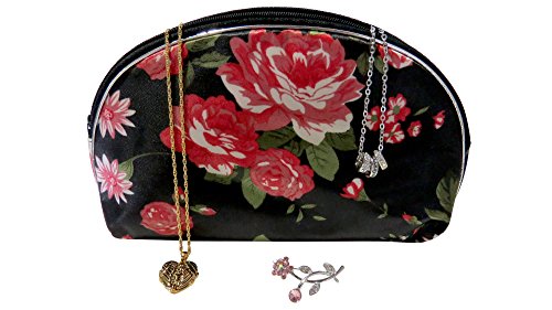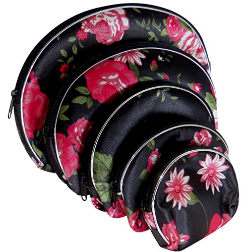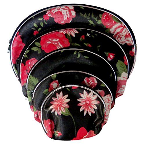 - Nesting cosmetic bags, with an oriental flare, feature vibrant flowers on a black background.
