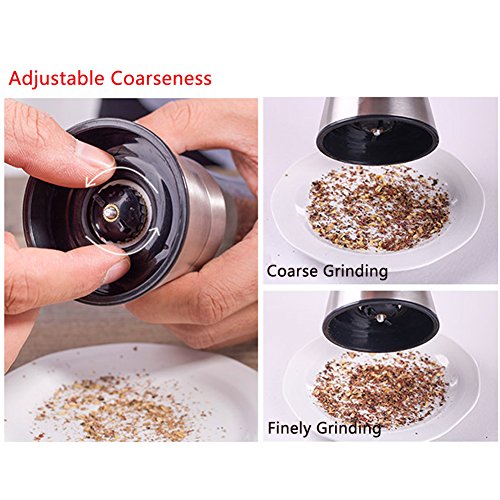 - CONVENIENCE & FUNCTION: Unlike other spice grinder sets, this salt and peppermill pair have their grinding mechanism on the top of the grinder, ensuring salt and pepper ends up only on your food -- not all over your table. The ceramic grinder is non-corrosive and won't absorb flavors, while a plastic knob on top of each salt and pepper mill allows you to easily adjust from a fine to coarse grind.