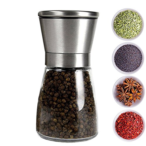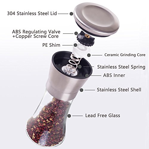 - ELEGANT DESIGN: With its brushed stainless steel encasing, glass body and ceramic grinder, this unique grinderis a professional, sleek addition to any kitchen, with a stainless steel lid that truly "caps" off this beautiful set. No tacky electrical grinders here means no batteries required- -only a few effortless twists with your hand to experience that fresh himalayan salt, pepper, or other spice.