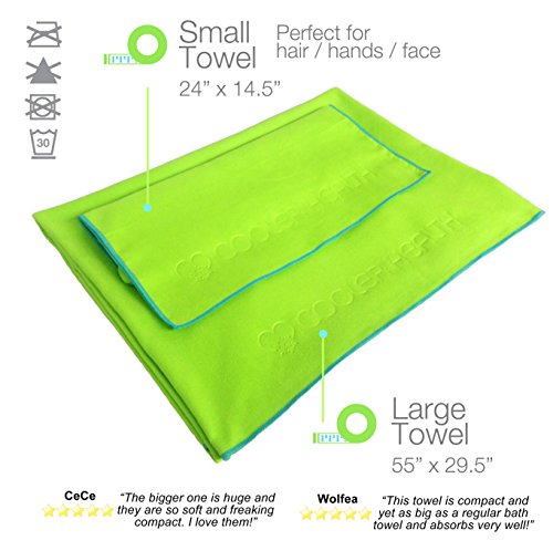 ✔ COMPACT SIZE: Lighter and smaller than bulky cotton towels! PERFECT companion for travel and effortlessly fit into your bag. Take it with you to the GYM, YOGA or POOL. Each towel even has a HANGING LOOP for your convenience. Large Towel 55”x29.5” Small Towel 24”x14.5”.