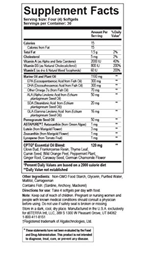 - Formulated with a proprietary blend of doTERRA CPTG Certified Pure Therapeutic Grade essential oils of Clove, Frankincense, Thyme, Cumin, Wild Orange, Peppermint, Ginger, Caraway, and German Chamomile, and includes 800 IU of natural vitamin D and 20 IU of natural vitamin E and a clinically-substantiated microalgae carotenoid extract of pure astaxanthin