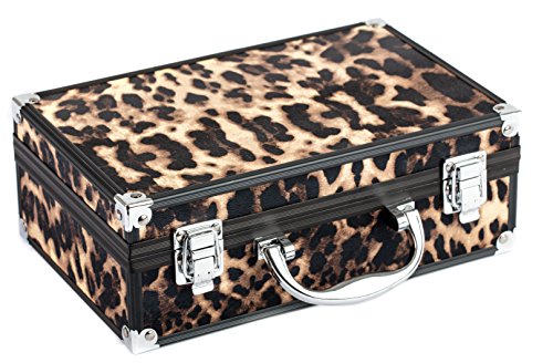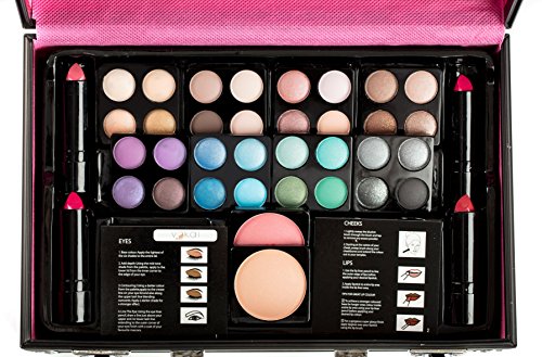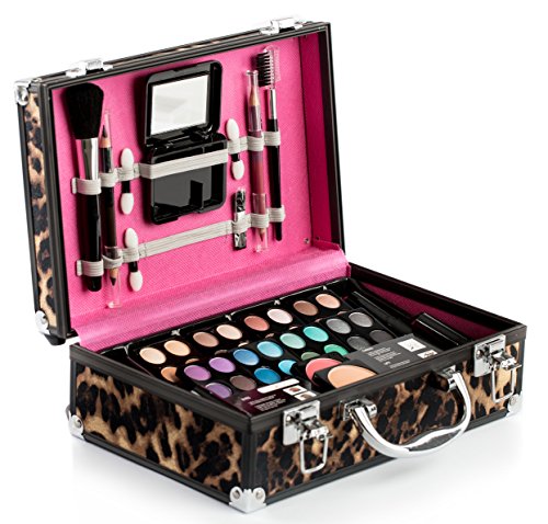 Contents: Leopard print carrying case 32 eye shadows 2 blushes 4 lipsticks 1 dual-tip eye pencil 1 dual-tip lip pencil 3 dual-tip applicators 1 blush brush 1 powder brush 1 eyebrow brush 1 refillable compact 0