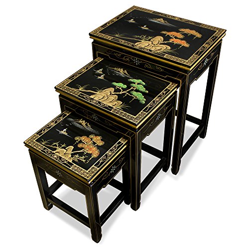 -. Brand : ChinaFurnitureOnline -. Color : Black -. Feature : Dimensions: 18"W x 13"D x 24"H / 3 different sized tables; Can be used individually or as a set / Exquisitely hand-painted gold scenery on black background / Crafted of wood / Hand-applied shiny black lacquer finish -. Label : ChinaFurnitureOnline -. Manufacturer : ChinaFurnitureOnline -. MPN : MNTSBG-L -. PartNumber : MNTSBG-L -. ProductGroup : Furniture -. ProductTypeName : HOME_FURNITURE_AND_DECOR -. Publisher : ChinaFurnitureOnline -. Studio : ChinaFurnitureOnline -. Title : China Furniture Online Black Lacquer Nesting Table, Hand Painted Chinese Mountain Landscape Set of 3 Table