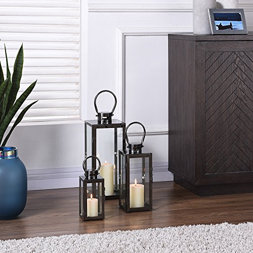 -. Feature : Dimensions: Lg: 20 inches high x 6 3/4 inches wide x 6 1/4 inches deep Md: 14 5/8 inches high x 5 1/8 inches wide x 4 3/4 inches deep Sm: 10 5/8 inches high x 3 5/8 inches wide x 3 7/8 inches deep / Set includes 3 lanterns: Small, Medium and Large / Good for indoor or outdoor use. / For use with pillar candles (not included)