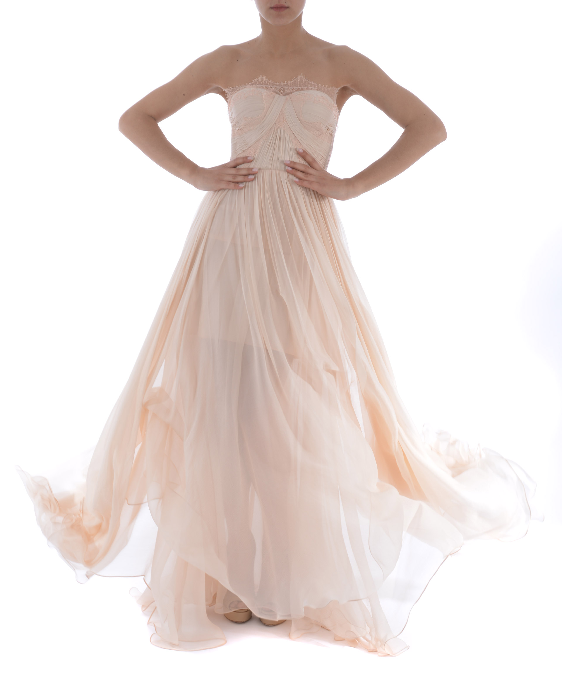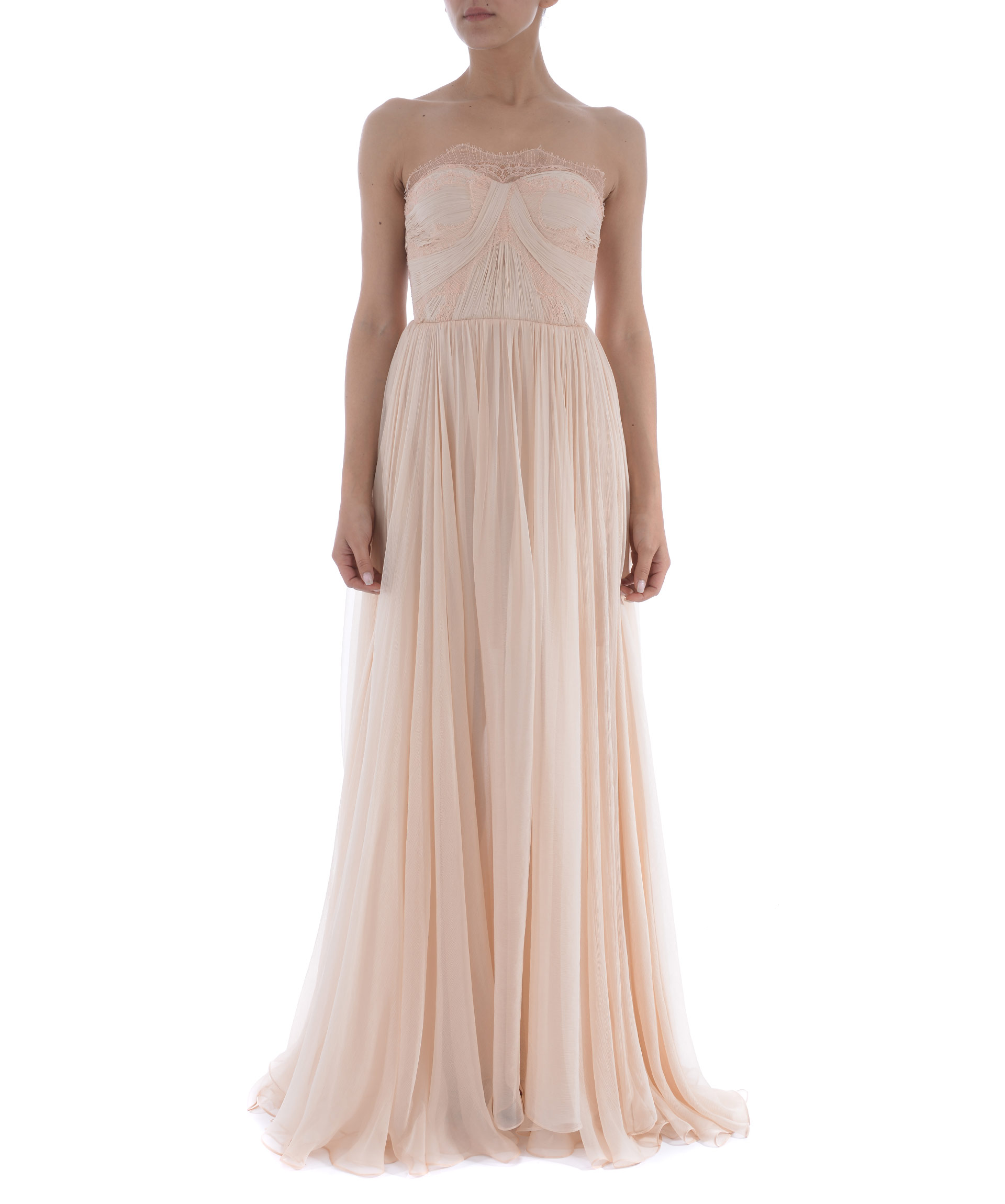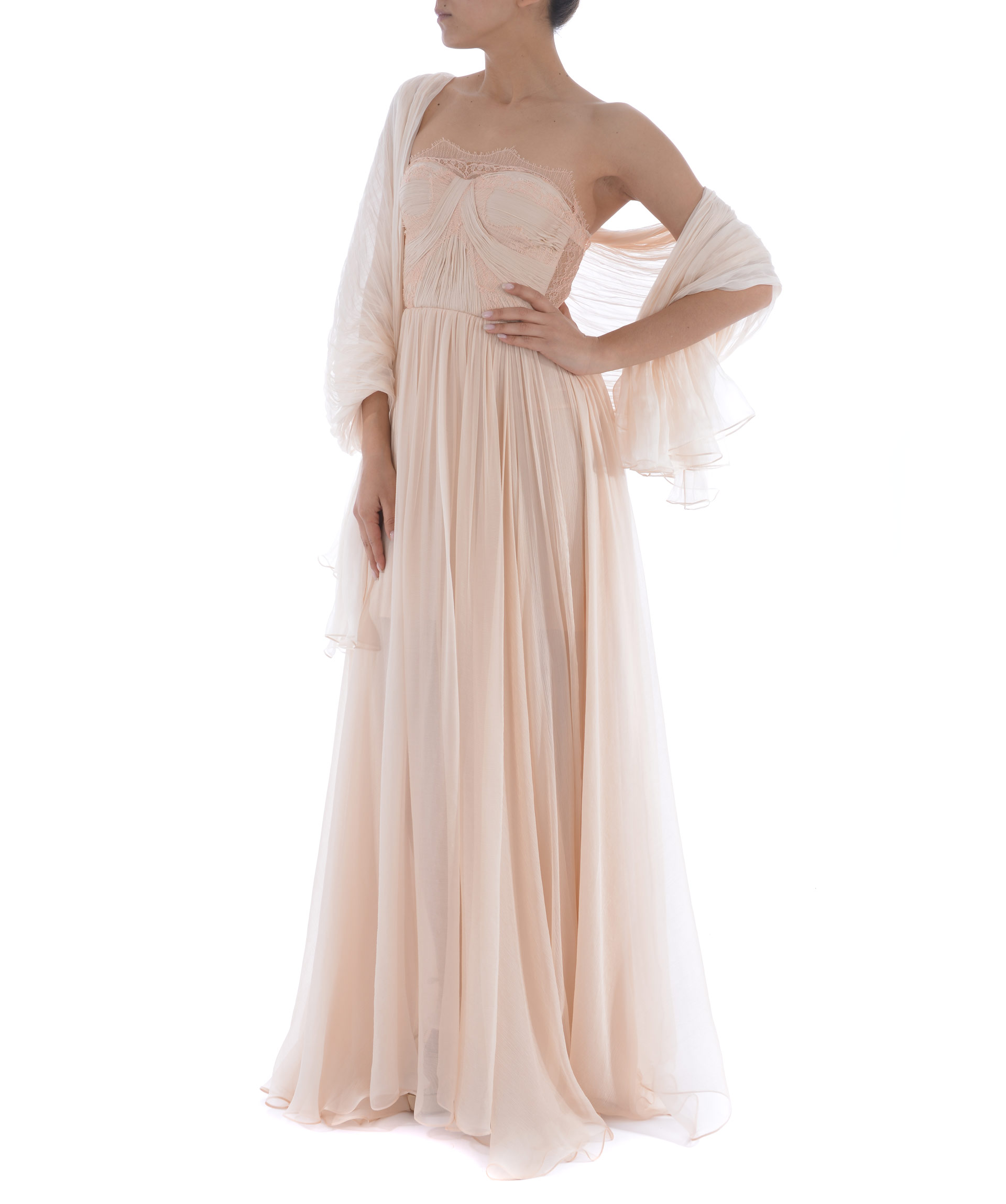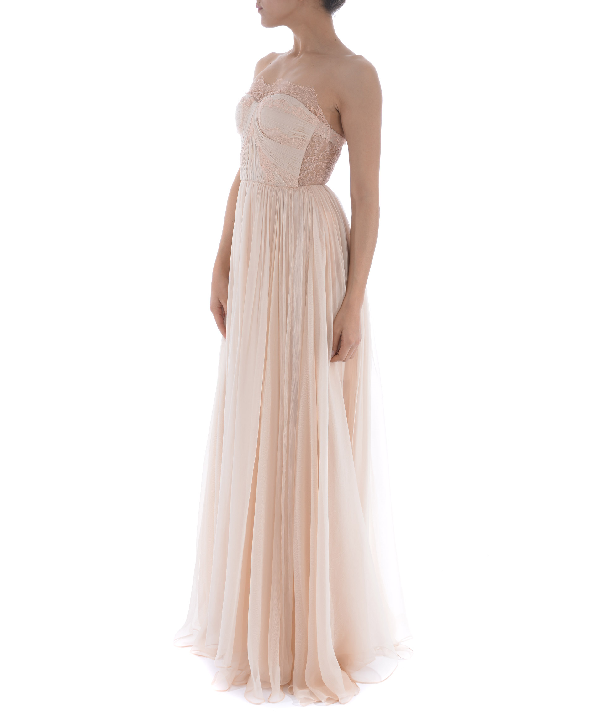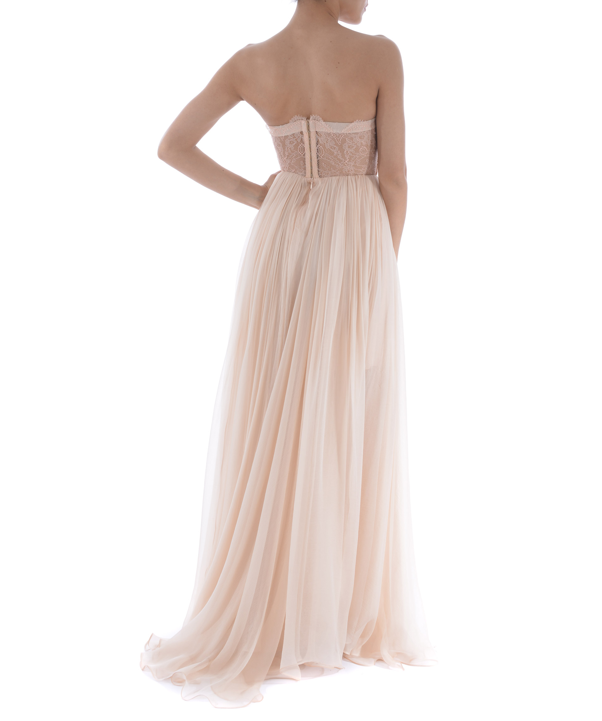 Abito lungo Maria Lucia Hohan in mussola di seta Rosa chiaro. Inserti in pizzo. Pannello posteriore in pizzo con trasparenze. Scollo a cuore. Bustino steccato. Coppe imbottite. Taglio in vita. Chiusura sul retro con zip e ganci. Fodera in microrete. Stola non inclusa.