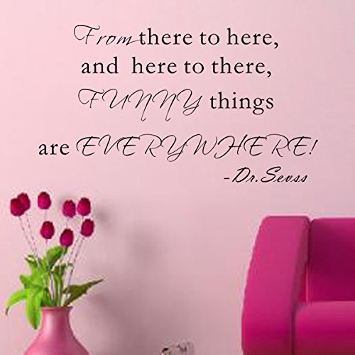 ReleaseDate : 2015-10-24 Studio : Pop Decors Publisher : Pop Decors Binding : Baby Product Product Description High quality wall art product by Pop Decors, creates hand painted look on your wall. Free squeegee. SIZE: 32"W Color: Black The text says: From there to here, and here to there, Funny things are EVERYWHERE.-Dr. Sevss Decals can be applied on smooth and clean surface (walls, glass, doors etc. . ). Not recommended for textured walls (orange, sandy and grainy), fresh paint (less than 14 days) or low VOC (Volatile organic compound) paint. Original designs by Pop decors. 2010 Copyrights Protected. . 0