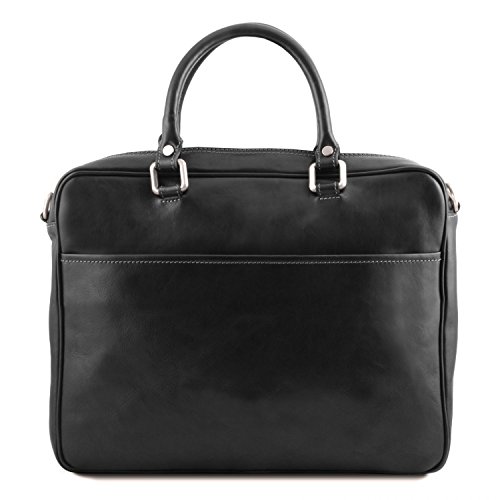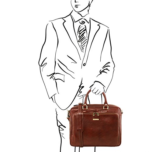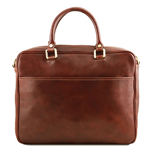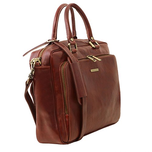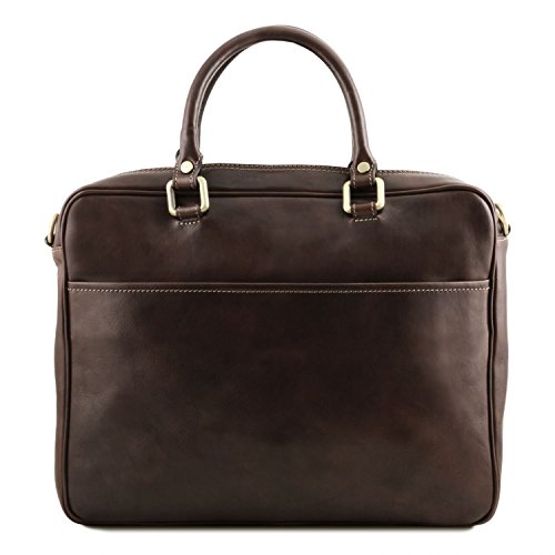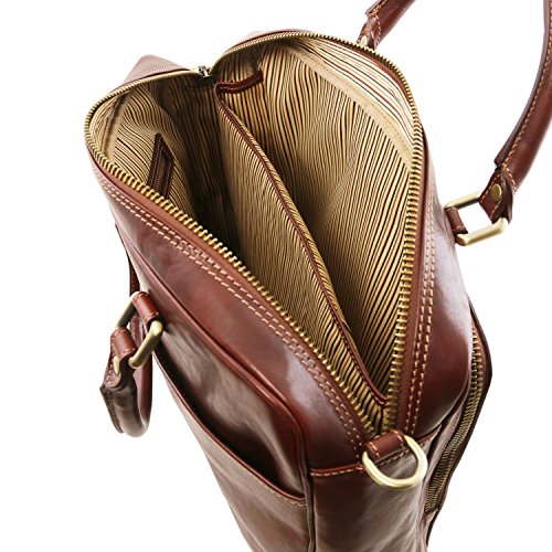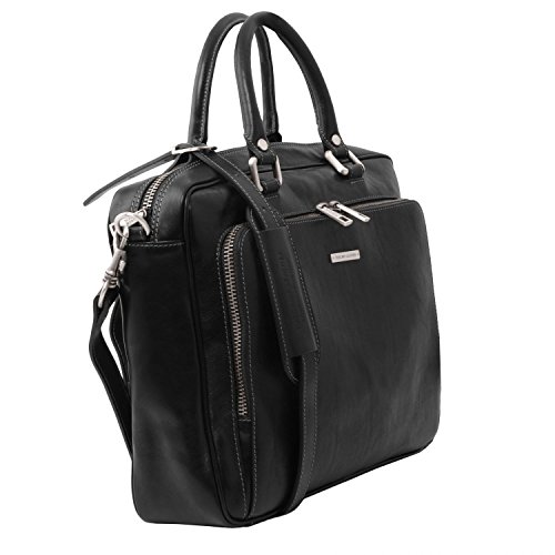 Materials: Polished calf-skin leather Inside material: Cotton lining Outside part: Back side pocket with magnetic closure Front pocket with zip closure Semi-rigid structure Inside part: 2 compartments Inside zip pocket Internal padded partition Laptop internal compartment Can fit A4 format Hardware: Antique brass hardware Nickel hardware Closure: Metallic zip closure Shoulder strap: Adjustable strap Detachable shoulder strap Leather shoulder strap Laptop case: Shock absorbent Handles: Leather handles Dust Bag: Dust Bag included