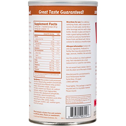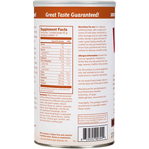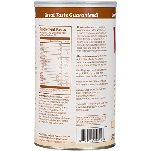 -. Binding : Health and Beauty -. Brand : Excel -. Feature : Delicious All Natural Whey Protein mix / 20g of protein, 3 g of fiber / Mixes easily in just water for a delicious lower total calorie shake / Hormone Free, No Artificial Flavors, Colors, or Sweeteners / 100% Satisfaction Guaranteed -. IsAdultProduct : 0 -. Label : Excel Performance Sciences, Inc. -. Manufacturer : Excel Performance Sciences, Inc. -. MPN : 200300 -. PackageQuantity : 1 -. PartNumber : 200300 -. ProductGroup : Health and Beauty -. ProductTypeName : HEALTH_PERSONAL_CARE -. Publisher : Excel Performance Sciences, Inc. -. Studio : Excel Performance Sciences, Inc. -. Title : Whey Fantastic
