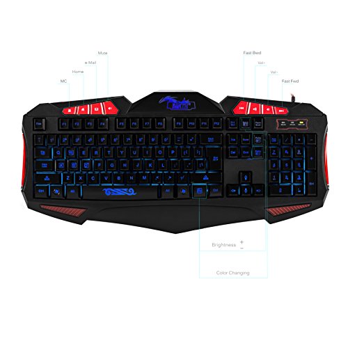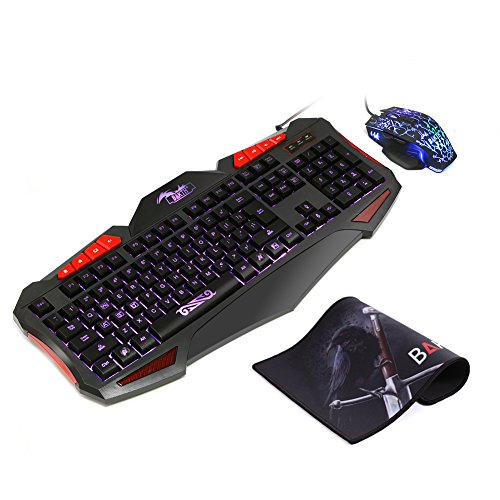 -. Feature : Supports MacBook, Windows 10, 8, 7, Vista, XP or later operating system. Good USB connectors, anti-slip textured surface, and comfortable ergonomic design. / Three adjustable LED backlighting (Red Blue Purple) keyboard and seven color backlit mouse. / 2400 DPI gaming mouse with 4 preset levels (800, 1200, 1800, 2400), you can use it smoothly when playing game. / Package contents: 1 x BAKTH three adjustable backlit keyboard, 1 x BAKTH seven color backlit gaming mouse, 1 x BAKTH customized mouse pad as free gift. / Ergonomic, ultra-low profile keyboard and mouse. You can just press FN+SL, then the backlit of the keyboard will change color(red, blue and purple). Fn + PaUp/ PaDn adjust the keyboard's brightness.