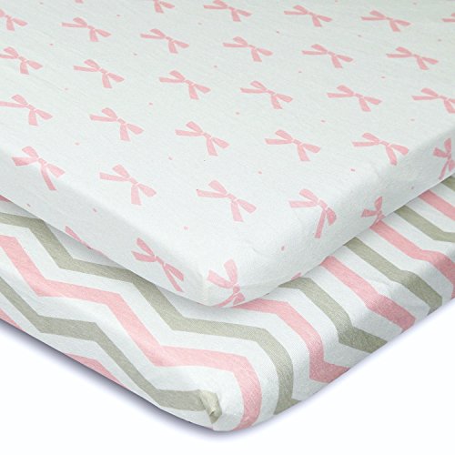 -. Title : Cuddly Cubs Pack n Play Playard Sheets - Set of 2 Jersey Cotton Fitted Sheets for Mini/Portable Crib Mattress - Gray and Pink with Chevron, Dots & Bows - TOP QUALITY Nursery Bedding for Girls