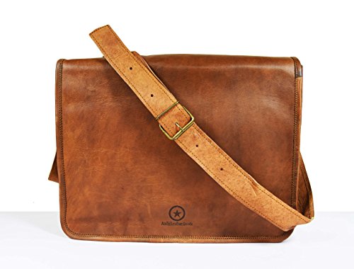 -. Feature : 100% Authentic : Average leather messenger bags are cheap & fake, but yours is handcrafted with genuine goat leather. Rugged, eco-friendly & affordable. / Dimensions: 15x11x4 Inches. / Strong & Durable: Brass Fittings & Buckles, YKK Zippers, Olive Green Heavy Duty Canvas Lining....Built to Last: This leather satchel features quality stitching, brass buckles & strong zippers. Ultra-durable, reliable & secure. Even has heavy-duty Canvas & Velcro strap to protect contents. / Deep Essentials Handy: With 2 +1 compartments , 2 Inner Zipped Pockets & One External Zipped Pockets, your 15-inch shoulder bag is perfectly sized for tablets, laptops, notebooks & more. Ideal for office, college & school. / Multiple Carry Options: With a convenient, adjustable shoulder strap & sturdy handle, this brown laptop bag can be worn on shoulder, cross body or in hand. Great for bikes & buses.