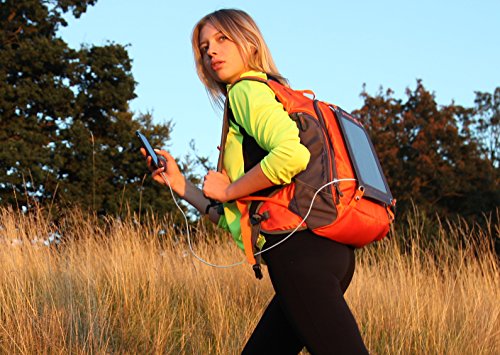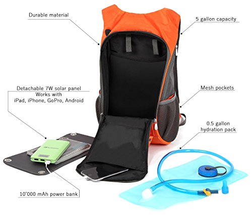 -. Feature : Outdoor backpack with removable solar panel and power bank / Charge any USB-powered device wherever you are / Hydradtion backpack ideal for hiking, biking or camping / 20L daypack great size for tech-savvy travellers / Tested with iPhone, iPad, Android and GoPro devices