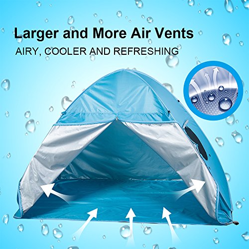 UV Guard Protection & Wind Resistance: Special interior silver-coating fabric around the full coverage to ensure the coverage area of Anti-UV effects. Provided sand pockets, extra long stakes and wind resistance cords work together to secure the tent in place under windy conditions.