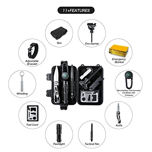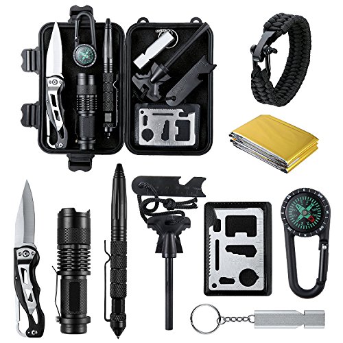 Defler Professional 11-in-1 Emergency Survival Gear Kit Outdoor Tool with Fire Starter, Whistle Knife Flashlight Blanket