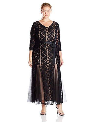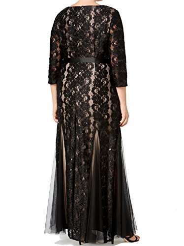 With a black/nude vertical all over lace, flare detail on a godet skirt, illusion sleeves, and a simple belt, this dress elongates the body and is perfect for a special occasion. This dress is perfect for a mother of the bride or another formal evening event.Feature