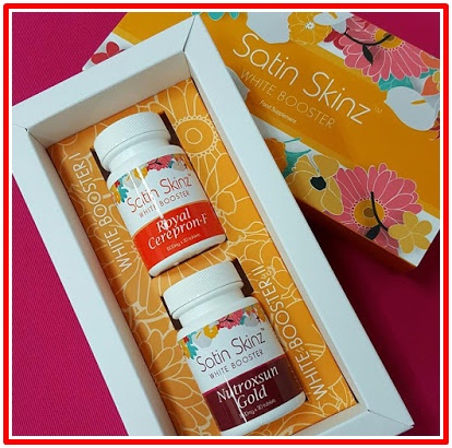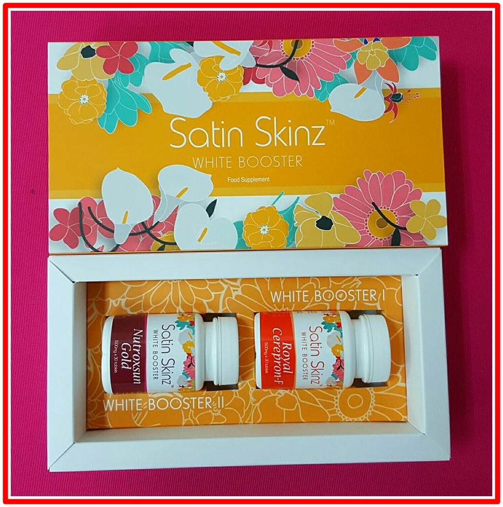 CIRI - CIRI SATIN SKINZ WHITE BOOSTER MEMPUNYAI 2 FORMULA HEBAT : 1. ROYAL CEREPRON-F Cerepron-F, Vitamin C, Collagen Mempunyai bahan dari Extract Yis yang sangat Berkualiti Tinggi & ianya juga bertindak sebagai PENGANTI kepada Glutathione kerana ianya mengandungi L-Cysteine Peptide dan akan merangsang Glutathione secara semula jadi dlm badan... Ini bermakna, Glutathione yang terhasil dalam badan kita merupakan Glutathione yang ORIGINAL / SEMULAJADI ye.... Kulit akan LEBIH CEPAT CERAH , GEBU & FLAWLESS 2. NUTROXSUN GOLD Nutroxsun,Astaxanthin, Apple Stemcell, Vitamin C Rosehip, Fish Cod Collagen, Super Orange, Super Papaya, Grape Seed�� Ia merupakan FORMULA PERTAMA DI MALAYSIA yang bersifat PHOTOPROTECTIVEatau dalam bahasa lebih mudah PELINDUNG SINARAN UV .... Lepas nih, kite dah tak perlu lagi nak risau jika terpaksa terdedah kepada Sinaran Matahari lagi.... Memang CONFIRM tak Burn