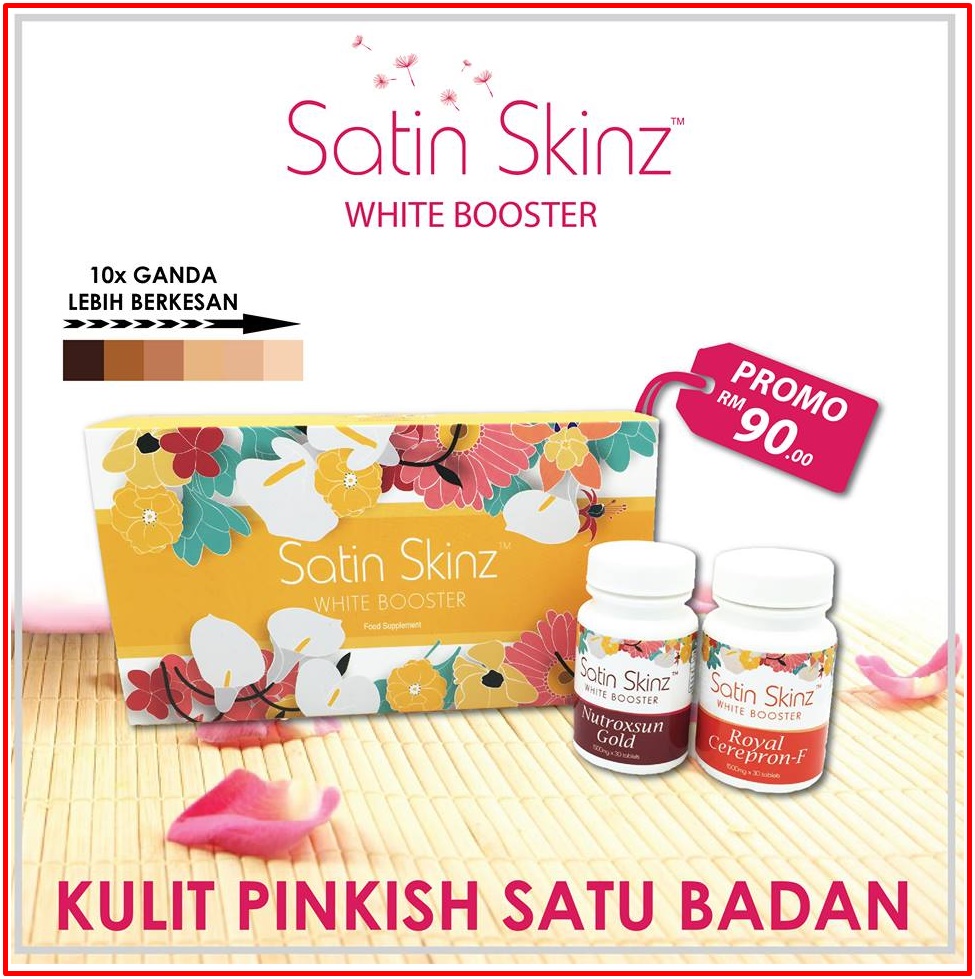 KELEBIHAN SATIN SKINZ WHITE BOOSTER : Satin Skinz White Booster merupakan produk pertama di Malaysia yg mengasingkan bahan-bahan aktif kpd 2 formula utk mengekalkan khasiat semulajadi tanpa pertembungan bahan lain yg mungkin menyebabkan perubahan khasiat asal Produk pertama yg bersifat photoprotective (Pelindung Matahari) Siapa yg rajin berjemur tgh panas elok pakai ni..Confirm tak sunburn Kesan Pencerahan 10x ganda lebih kuat tanpa kesan sampingan. SATU BADAN PUTEH Mematikan kuman jerawat dgn mencuci darah kotor dan singkarkan toxin Jeragat hilang secara berperingkat di samping memberikan kulit anjal tegang seperti rawatan botox! Parut berlekuk dan parut jerawat hilang dgn cepat Melebatkan rambut serta mencantikkam kulit supaya lebih bersinar Merawat penyakit resdung dan bersin2 Kulit nampak lebih sihat dan kemerahan semulajadi Boleh di makan serentak bersama supplement pemutih yg lain!