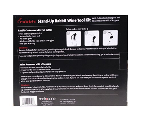 - Feature : Rabbit Corkscrew With Foil Cutter, Extra Spiral And Wine Preserver With 2 Stoppers / Pulls A Cork In 3 Seconds Flat / Automatically Ejects Cork / All-Metal Gears / Works on All Bottle Sizes And Cork Types