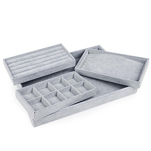 ★STACKABLE 4 IN 1:You will get 4 trays, 1 big and 3 small(1 big tray,1 pcs ring tray,1 pcs 8 grids tray,1 pcs necklace tray), with just one click.They can stackable together.A tray meet a variety of requirement.