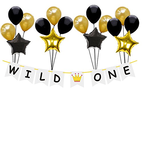 -. Feature : 🍷PACKAGE; WILD ONE,Crown,and Rope,Black/Gold Balloon 12 Pcs,Black/Gold Stars Balloon 4 Pcs,3 yards of rope and Inflatable tube / 🍷WILD ONE SIZE; Width 4.76 Inches, Height 5.74 Inches,Latex Balloon 12 Inches, Stars 18 Inches / 🍷WILD ONE Balloons To Celebrate Your Baby's Birthday, Which Express The Wishes To Your Baby Would Have a Brave, Free, Brave, Happy Life In His Future / 🍷30 Days Return Replacement, 100% Money Back : Your Satisfaction is Guaranteed.