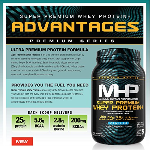 ReleaseDate : 2016-11-14 Studio : Maximum Human Performance Publisher : Maximum Human Performance Binding : Health and Beauty Product Description WHAT IS SUPER PREMIUM WHEY PROTEIN ? Super Premium Whey Protein is an ultra premium protein formula driven by a superior absorbing hydrolyzed whey protein. Each school delivers 25g of protein, 5.6 of BCAA including 2.8g of the anabolic trigger leucine and 200mg of anti-catabolic branched-chain keto acids (BCKAs) to reduce protein breakdown and spare anabolic BCAAs for greater growth of muscle mass, increases in strength and improved recovery. WHAT DOES SUPER PREMIUM WHEY PROTEIN DO? Super Premium Whey Protein provides you the fuel you need to maximize your workout each and every time. It's the perfect combination for athletes, fitness enthusiast of those trying to lose or maintain weight to accommodate their active lifestyle. WHAT MAKES SUPER PREMIUM WHEY PROTEIN BETTER THAN OTHER PROTEINS? Super Premium Whey Protein is fueled by a superior absorbing hydrolyzed whey protein, and is fully transparent so you know exactly what you are getting in every scoop. It also features a potent dose of novel BCKAs, which helps to lower broken breakdown and speed recovery. Plus it is informed choice certified for no banned substances, and features an extremely low everyday low price of $23.99. 0
