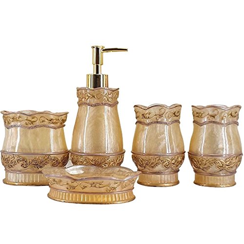 - QUALITY RESIN BATH ACCESSORY; the Marquee 5-Piece Bath Accessory Set is made of durable resin that can easily last a lifetime! Soap remnants don't adhere to the surface of the resin, meaning that you can easily clean up every piece in the set.