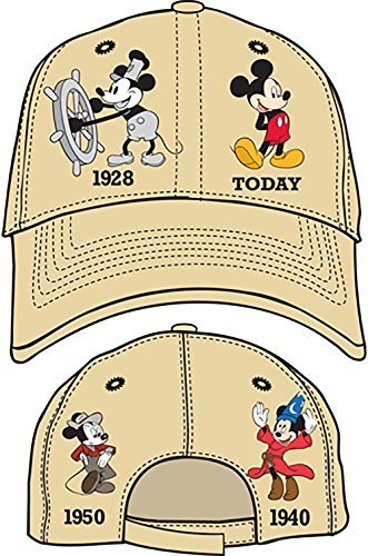 Embroidered images encircle the khaki 100% cotton cap, depicting cartoon Mickey and his evolution over the decades.