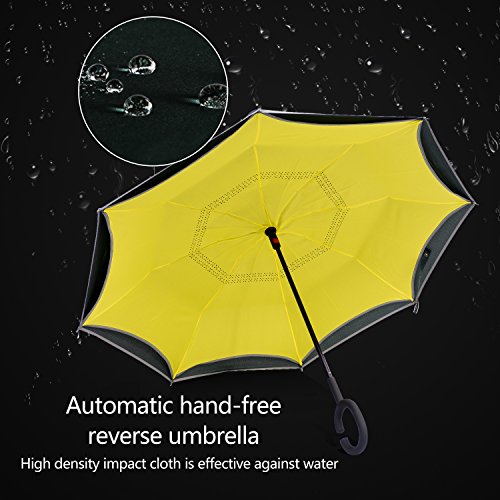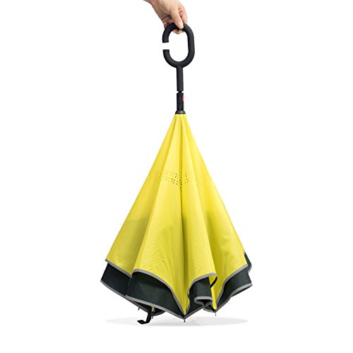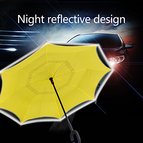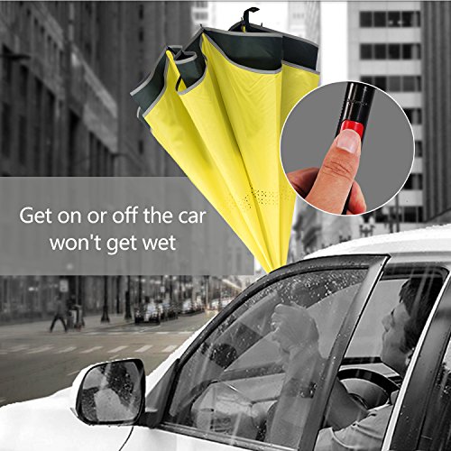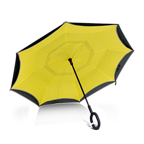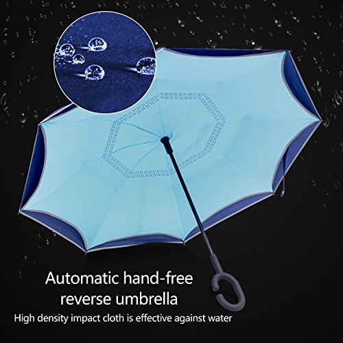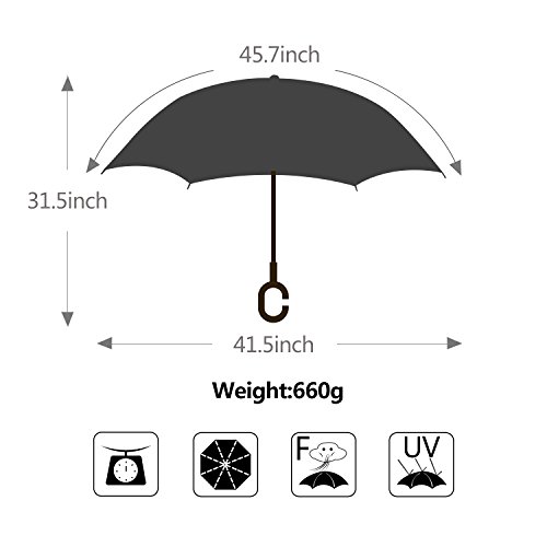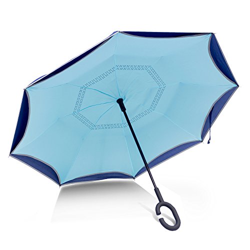 Studio : Azuki Publisher : Azuki Binding : Misc. Product Description No more worry of rainy day from now on! Soft Plastic C Shank Holding an umbrella with your wrist, you can free your hands use your phone, or even hold a baby. Water Repellent Fabric 190T 75D cloth density anti dirty, quick-drying Protect you from rain, strong wind, snow, drip permeation and ultraviolet, etc. Double cloth density get better thermal insulation Umbrella Frame Material Strong carbon fiber central rob and double 8 durable steel frame ribs can prevent umbrella form flipping inside out, and lightweight. Reflective stripe, make you safe at night. New Inverted Design When you jump on a crowded train after escaping a downpour your dripping wet umbrella usually brushes up against your bag, your clothes. But inverting the design, the wet side of umbrella faces inward when closed, exposing only dry side. And that's not all: the creative design makes it easier to open when coming out of a car or other covered area, and when not in use the umbrella can stands up on its own! Double layer Inverted umbrella Unique design double layer inside out umbrella, make it easy on a raining day, won't wet your car, documents or others. Advanced double layer ribs made inverted umbrella more sturdy. inner layer's air vent increase air circulation. Measure 31.5" long and 41.5" in diameter when open. It's large enough to shelter both you and your loved one from the downpour Easy to Operate and Safe Use With a simple click with embedded button, can easy open and close umbrella in confined spaces when entering or exiting a building or car and it's less awkward and more safer to open and close when in crowd, since the danger to poke in people's eyes has been removed by the design. Saftey Reflective Stripe Reflective piping makes you visible even in low light, preventing collision and keeping night walking or hiking safe. 0