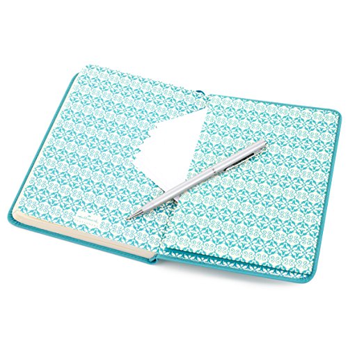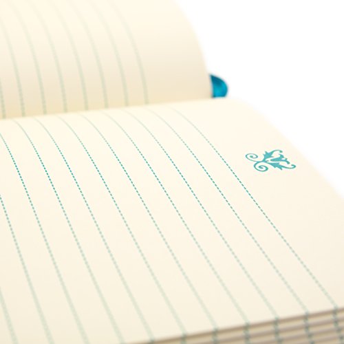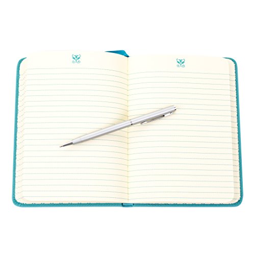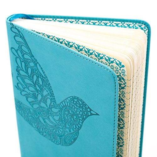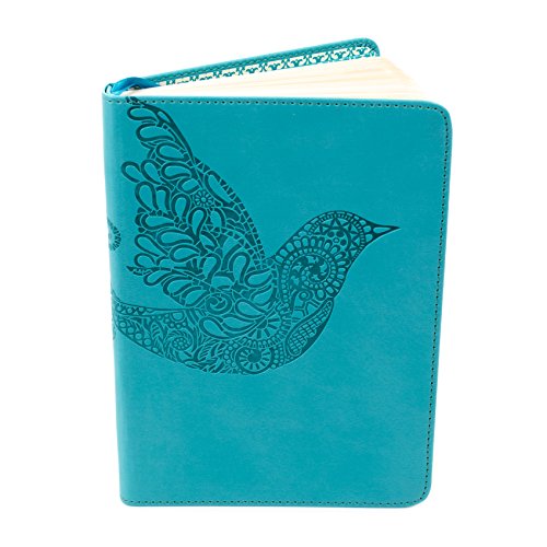 Faux leather softcover journal in turquoise features an intricately designed embossed bird on the cover and a satin ribbon bookmark.