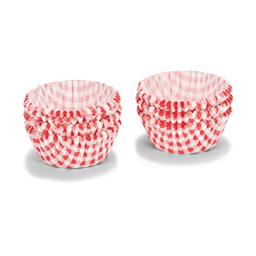 [Product Information]- 200 individual round paper cupcake cases for baking cupcakes delivered in a red and white checked gingham pattern
