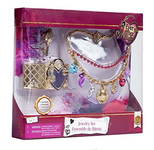 -. Binding : Toy -. Brand : Ever After High -. EAN : 0885577136075 -. Feature : Complete 3 piece Ever After High Jewelry Set (Necklace, Bracelet and Ring) / Includes Necklace with 5 charms (inspired by the Ever After High Royals and Rebels) / Antique finished Cuff Bracelet (One Size fits most) / Includes beautiful ring to help you unlock your destiny / Jewelry set features safety attachment snaps -. IsAdultProduct : 0 -. Label : Xcessory Intl - Toys -. LegalDisclaimer : WARNING: CHOKING HAZARD - Small Parts. Not for Children Under 3 Years. -. Manufacturer : Xcessory Intl - Toys -. Model : 150306003 -. MPN : 3337264 -. PackageQuantity : 1 -. PartNumber : 3337264 -. ProductGroup : Toy -. ProductTypeName : TOYS_AND_GAMES -. Publisher : Xcessory Intl - Toys -. Studio : Xcessory Intl - Toys -. Title : Ever After High Jewelry Set -. UPC : 885577136075 -. Warranty : No Warranty