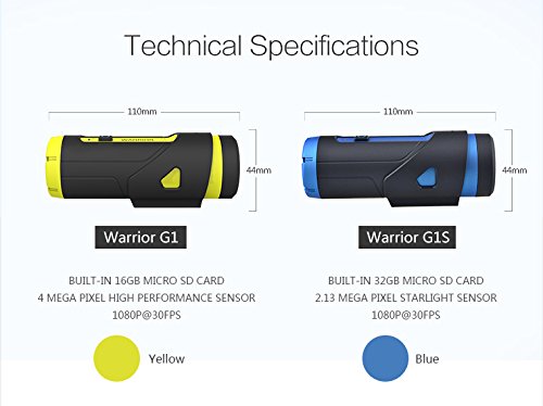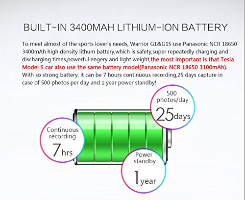 - Continuous Power Supply: Built-in 3400mAh Lithium-ion Battery, Big Power Supply Capacity, 6 - hour continuous Recording, 12-month Super-long Standby! And Warrior G1S uses ECO Start-Stop Technology to save more power for users. Its power can last for 50 days and each day at least 500 photos could be captured during these 25 days.